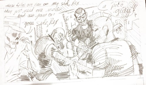 Who are the Bodega Boys, and why do I romanticize them? And of course, as you can see in the drawing above, I include references to the Bodega Boys in my current graphic novel in progress, Death in Oaxaca. In the comix work, I change the name of the jam group to “Los Mezcaleros”.