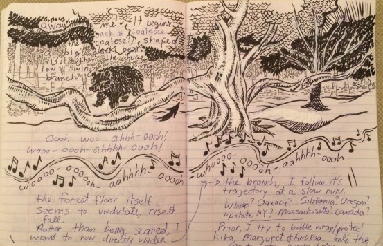 I’m inexorably drawn to a giant tree as a deep, undulating beat asserts itself. An enourmous low hanging branch forms a swaying arch and a black bear almost materializes above it. Fear? NO! I run right towards it.