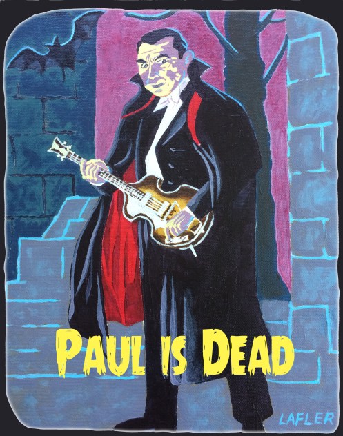 Here’s a new painting with the working title “Paul is Dead”. Yeah, it is a tongue in cheek title. Here’s Dracula playing a left-handed Hofner bass, a clue to the title of the work for sure! 11″ x 14″ acrylic painting.