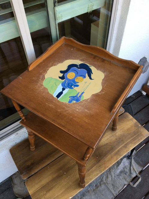 Above is the Ralph tabletop closeup. Below you can see the whole table, with the underpainting stage complete. This piece is on offer for $195, shipped insured. Send me an email if you see this in your space-age pad, and we’ll work out payment/shipping deets.