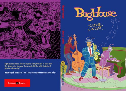 You can also pick up a copy of my BugHouse graphic novel at my Lulu store. BugHouse traces the rise of tenor sax genius Jimmy Watts and his piano cohort Slim Watkins to the pinnacle of the jazz world. Will they fall to the depths of addiction and depravity? The 192-page gem is Indigo-tinged “insect noir” at it’s best. Published as the first graphic novel in my 3-part trilogy with Top Shelf in 2000, this edition sneaks under the radar with my Cat-Head imprint.